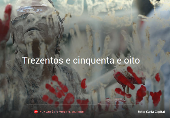 Este é o provável número mortos em Brumadinho. Estas pessoas não morreram, elas foram mortas pela Vale. As 358 vítimas não foram vítimas de um terremoto, de uma enchente, de um vendaval. Não. Os 358 assassinados foram vítimas da sordidez de quem defende o fim do Ministério do Trabalho e da fiscalização da segurança no ambiente do trabalho. Os 358 assassinatos foram vítimas da maldade da decisão do STF que autoriza toda e qualquer terceirização em nome da livre iniciativa absoluta. Os 358 assassinatos são vítimas de quem defende o estado mínimo e a o desaparecimento da legislação ambiental. Os 358 assassinados são vítimas da reforma trabalhista que moderniza a exploração e fixa limites de indenização por dano moral. Os 358 assassinados são vítimas de uma justiça seletiva que até agora não prendeu os executivos da Vale e que já haviam matado em Mariana.